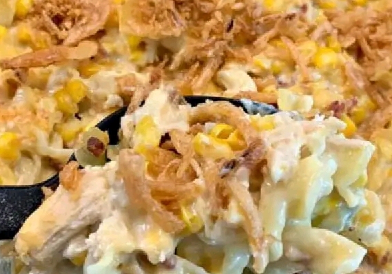 2. In a medium bowl, combine the cooked pasta, chicken, corn, milk, cream of chicken, onion, garlic, cheese, bacon, and salt/pepper.